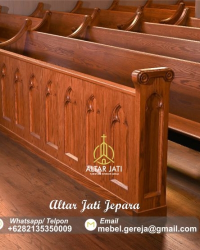 Bangku Gereja Klasik Modern merupakan sebuah produk Bangku Gereja model yang estetik dan elegan. Kursi Jemaat Gereja ini mempunyai gaya modern yang minimalis terbaru untuk melengkapi ruangan interior gereja dan tempat beribadah di gereja. Dengan bahan kayu jati berkualitas dan dikerjakan oleh tukang ahli jepara akan menjamin ketahanan Bangku Gereja Klasik Modern. bangku gereja ini sangat cocok untuk mengisi interior gereja agar jemaat gereja lebih nyaman dalam beribadah. Sangat cocok untuk mempercantik ruangan gereja. Lengkapi interior gereja anda agar semakin menarik dan nyaman dengan berbagai model produk Mebel buatan kami.